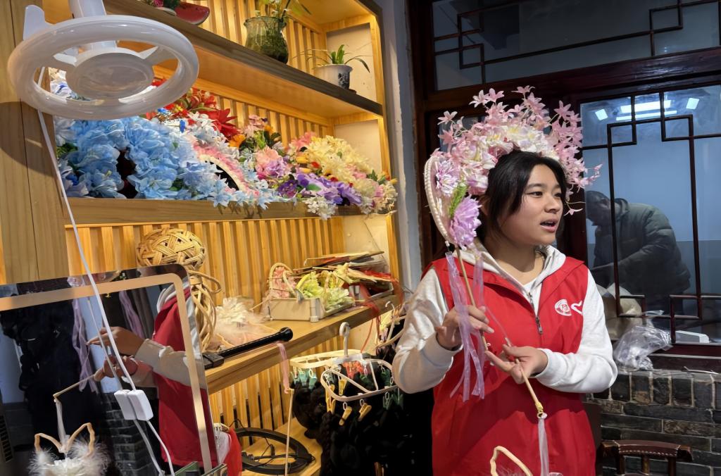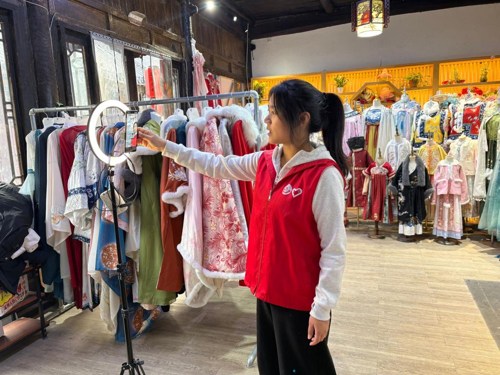 志愿者到达周村古商城后,在巷角一间“藏”于小角落的汉服店停下脚步,这里不仅陈列着各式汉服,还配套展示了周村簪花、鲁绣配饰等非遗手作。团队以“壹间汉服”店铺的古色古香装修为背景,将直播间打造成沉浸式汉服文化体验空间。直播中,主播一边展示服饰的材质、精美刺绣与传统盘扣工艺,一边讲解不同款式的历史渊源与文化寓意,还针对日常穿搭需求,重点推介改良款汉服及发簪、团扇、披帛等配套配饰。