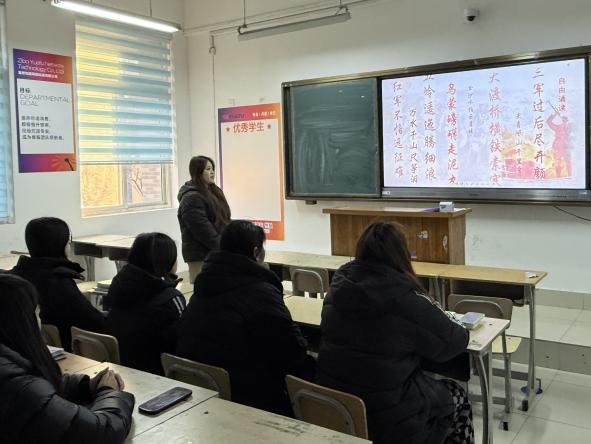 活动中,陶玉景老师首先阐述了毛泽东诗词的历史背景与时代内涵,是“中国革命的壮丽史诗”。师生共读《七律·长征》,通过长征历史影像沉浸感受峥嵘岁月。在恢宏交响乐伴奏下,师生齐声朗诵,情感随旋律层层推进,激昂之声将跨越时空的革命豪情推向高潮。