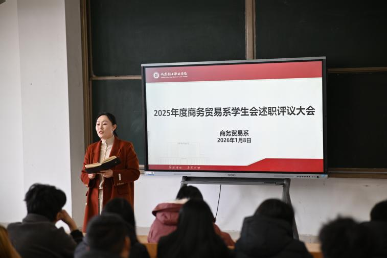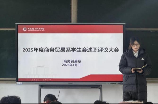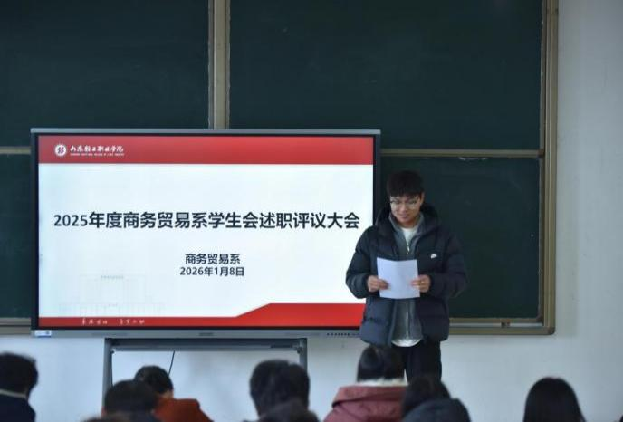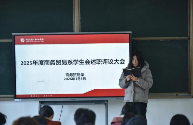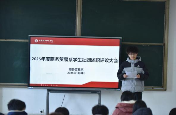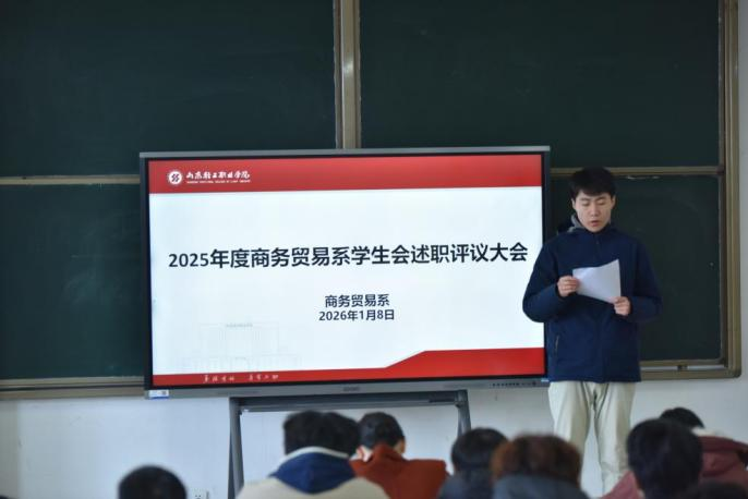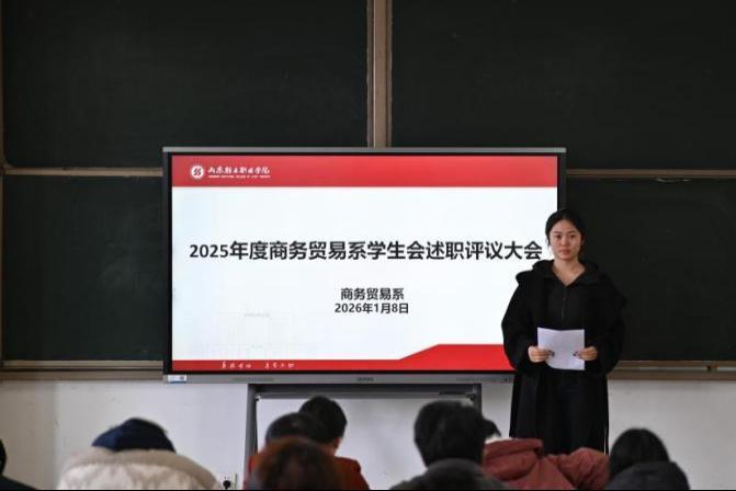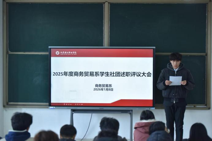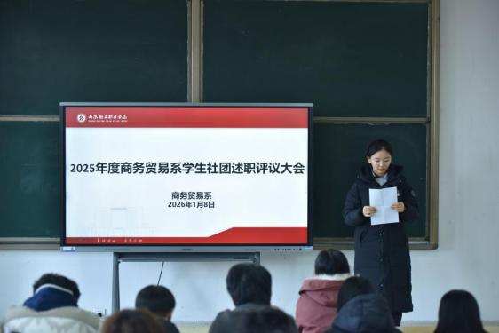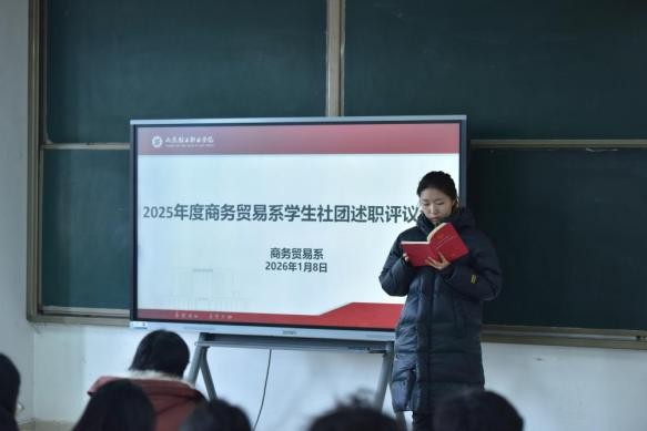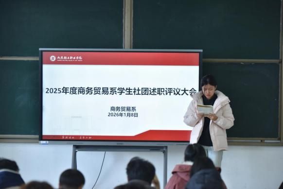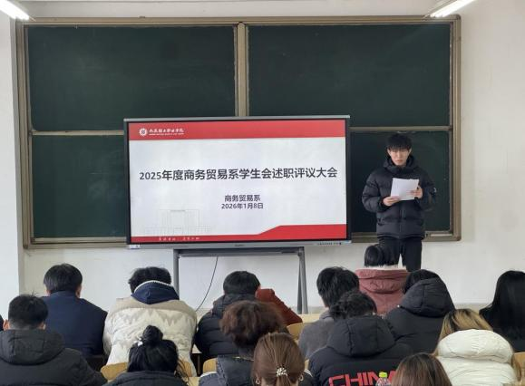为加强学生干部队伍建设,提高学生干部的实践能力和服务意识,商务贸易系于2026年1月9日在第六教学楼407召开2025年度学生会干部、学生社团述职评议总结大会暨寒假社会实践动员大会。商务贸易系学生科副科长蔡嘉慧、辅导员张潇靓及80余名学生干部参会,团总支副书记娄树娟主持会议。