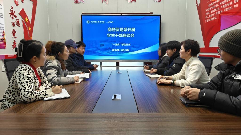 为深化大学生自我教育、自我管理、自我服务、自我监督、自我成长,进一步充分发挥学生干部在宿舍管理中的自治作用,优化三级网格化治理机制,2025 年 12 月 26 日,商务贸易系 “商话・轻听沙龙” 第十三期学生干部座谈会在商睿园举办。系党总支书记孙琳霞、辅导员徐彩霞及10 余名系学生会骨干代表参加座谈。