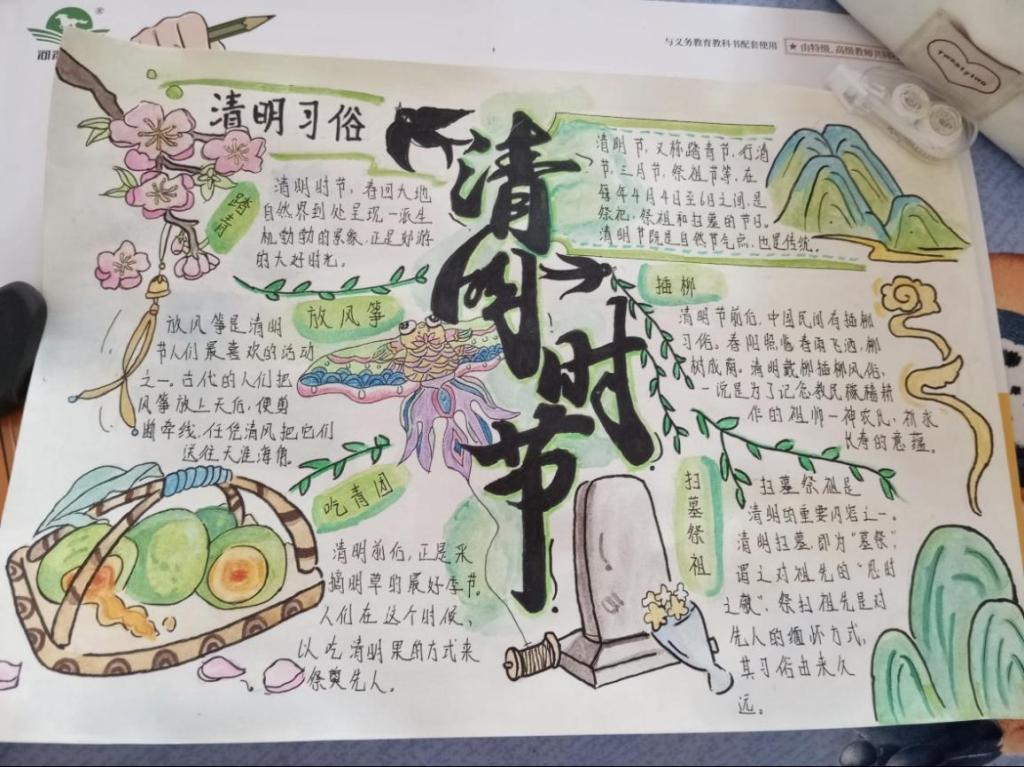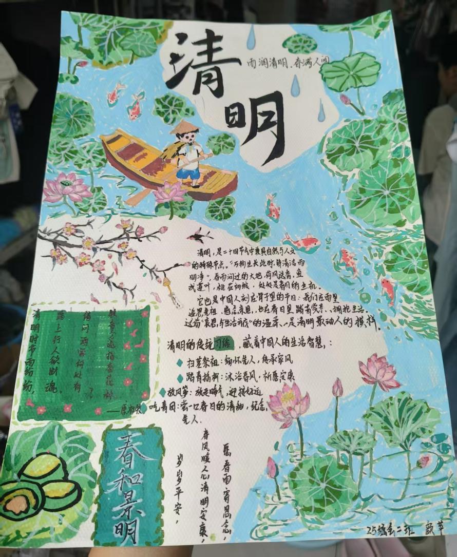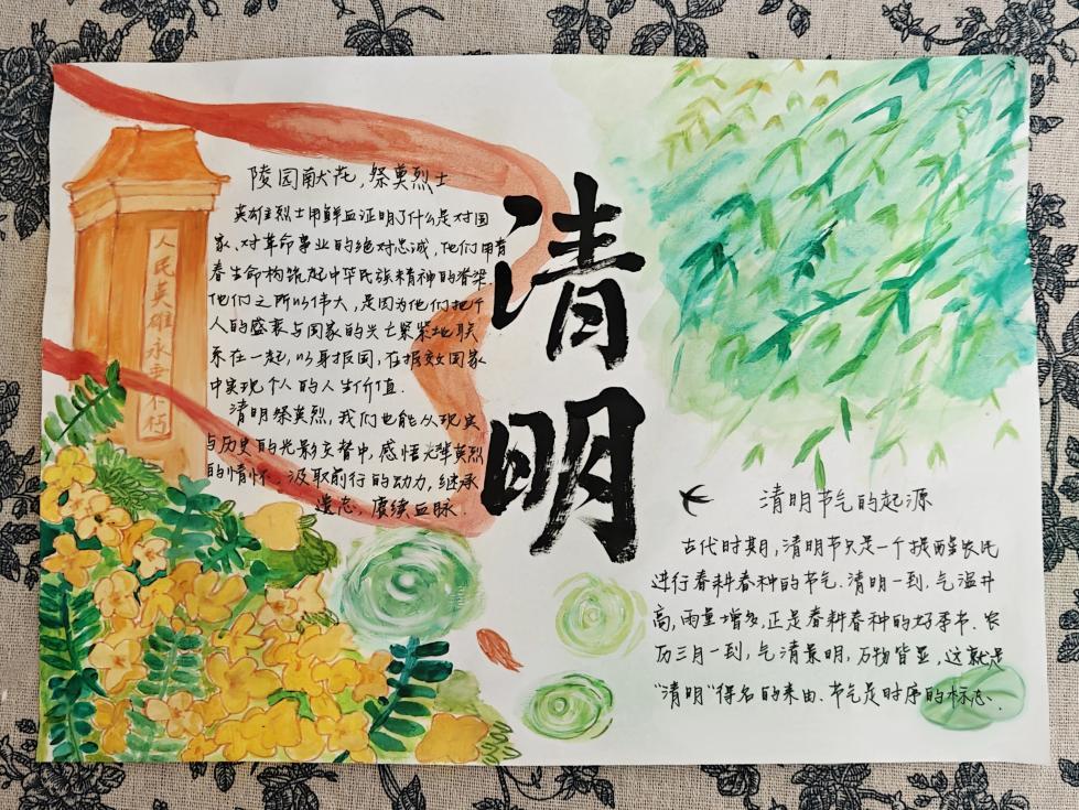 清明节假期,同学们围绕缅怀先烈、传统习俗、经典诗词等主题精心创作手抄报,用画笔和文字表达对先辈的追思与敬意。此次活动让大家在动手实践中深入了解清明文化内涵,感受传统节日的意义,进一步厚植了爱国主义情怀。同学们在创作中收获成长,纷纷表示要铭记历史、珍惜当下,以实际行动传承红色基因。