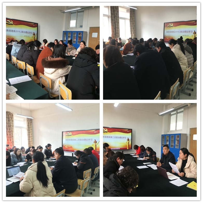 2019年2月23、24日,商务贸易系分别两次开展了政治理论学习,会议分别由主任巩向玮和书记李兴江主持,系部全体教师参加了学习。