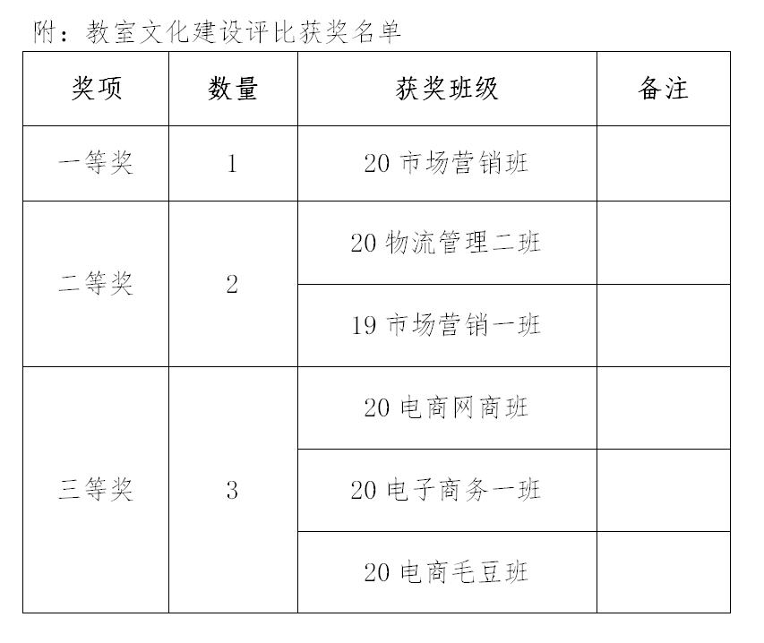 商务贸易系于11月下旬至12月中旬开展了教室文化建设评比活动,各班积极踊跃参加,系部统一制作标语、班规、班徽、班务栏,各班制作了以“学习强国”为主题的板报及班级特色建设,系评比小组于13、14周进行了现场检查和打分,20市场营销班等6个班级分获一、二、三等奖。