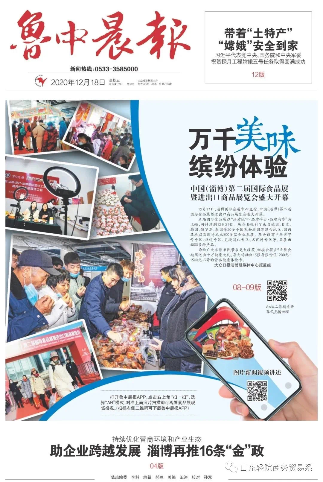 12月17日,中国(淄博)第二届国际食品展暨进出口商品展览会隆重开幕。山东轻工职业学院商务贸易系二十多名师生来到淄博国际会展中心,联合毛豆科技、大众日报为展览会助力,开展了一场全方位、全天候的直播。