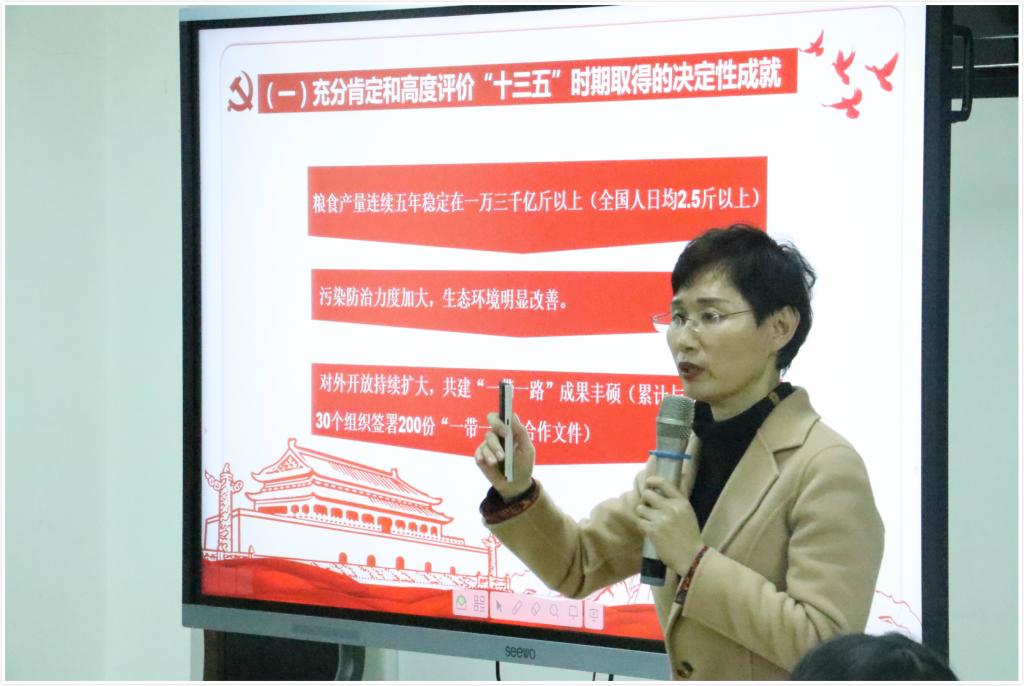 在全国上下学习党的十九届五中全面精神的热潮下,为提高大学生的学习热情,按照学校部署,12月24日晚自习商务贸易系在T6407合堂教室以“学习贯彻全会精神,凝心聚力共创未来”为主题开展党的十九届五中全会宣讲报告会,由商务贸易系党总支书记孙琳霞主讲,全体辅导员及120余名学生代表参会。