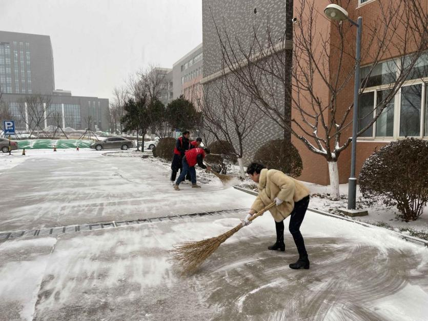 师生合力清扫教学楼周边道路。虽然风大天寒,工具不凑手,地上的冰与雪粘在一起,给清扫带难度,但丝毫不减师生们的劳动热情,清扫工具在同学们的手里不停地“飞舞”,校园内不时传出铁锹与地面的摩擦声,夹杂着扫帚的沙沙声,整个场面热火朝天,奏响了一曲快乐的冬日清雪之歌,经过大家共同努力,积雪被清理干净,方便了师生的出行,也温暖了人们的心灵。