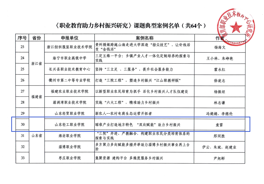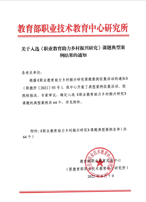 根据《职业教育助力乡村振兴研究课题案例征集活动的通知》(职教所[2021] 93号),教育部职业教育发展中心(原教育部职业技术教育中心研究所)开展了典型案例征集活动。经院校报送、专家审议,我校《瞄准产业打造地方特色“双向赋能”助力乡村振兴》案例成功入选。