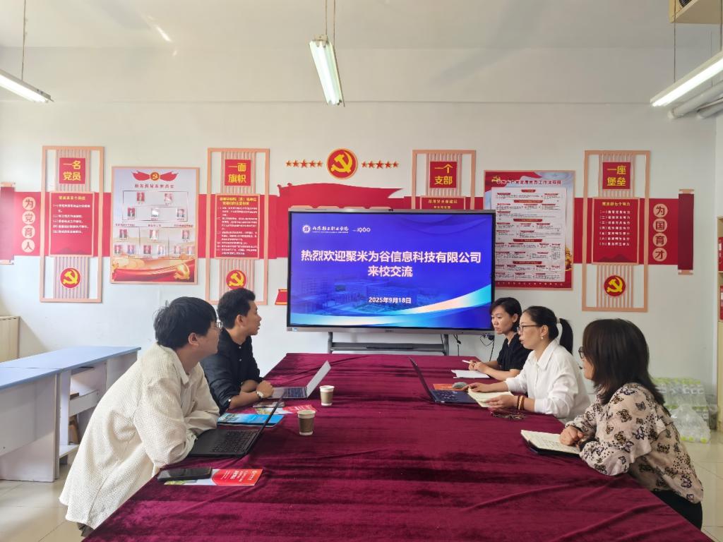 9月18日,聚米为谷信息科技有限公司集团总裁张镭等一行两人来校洽谈生产性实训项目事宜,商务贸易系主任杨新月等3人参加座谈。