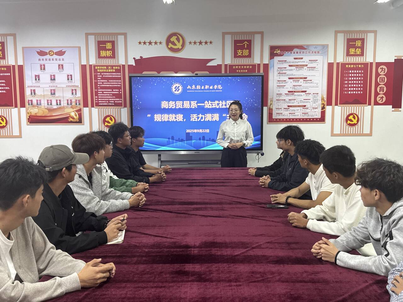 为营造安静有序的宿舍休息环境,保障学生充足睡眠与身心健康,9月22日商务贸易系在“一站式”学生社区开展“规律就寝,活力满满”夜间禁噪专题教育。辅导员徐彩霞主持,公寓二楼宿舍的舍长参与。