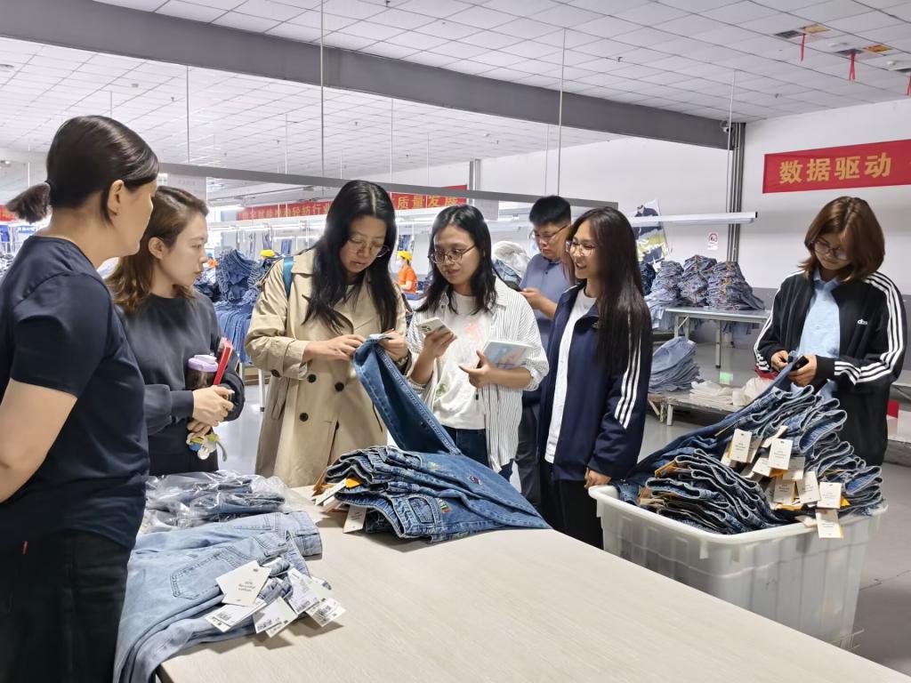 宏业集团深耕牛仔服代工二十余年,积累了丰富的代工经验和业内口碑。此次走访,双方深入探讨挖掘行业痛点,围绕牛仔代工企业数字化赋能、自有品牌打造及出海等一系列关键问题深入交流。随后,宏业集团总经理韩丽等带领我系师生参观了牛仔吊挂生产线、牛仔水洗车间、质检车间等。