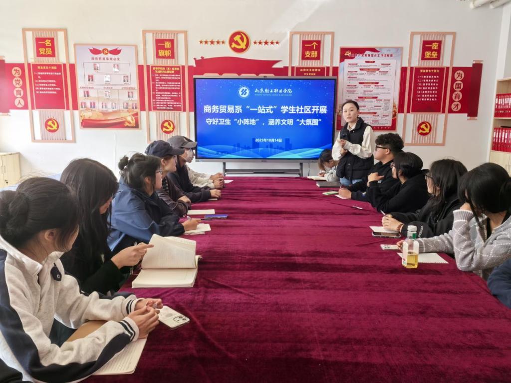 为培育学生文明素养,将“小宿舍”打造成文明育人的“大课堂”,10月14日,商务贸易系“一站式”学生社区在T6101开展“守好卫生小阵地,涵养文明大氛围”主题活动。全体25级班长团支书参加,推动宿舍卫生建设与文明习惯养成深度融合。