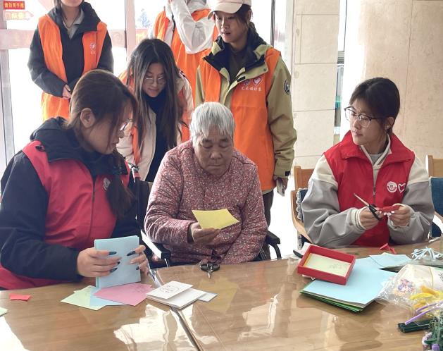10月22日,走进集养老、医疗、康复于一体的周村区淄博灯塔幸福院,与国际时尚学院团总支、艺术设计系团总支共同开展文化传承志愿活动。以非遗剪纸为媒,老少结对协作,一对一协助老人折纸、运剪、固定纸张、精修线条,在温馨愉快的互动中,一幅幅精美的剪纸作品于巧手翻飞间逐渐成型,现场笑语盈盈、其乐融融。老人们在剪纸艺术与青年陪伴中,感受到了浓厚而温暖的节日氛围。