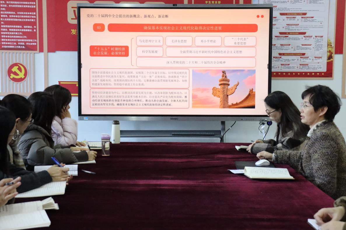 2025年12月25日,商务贸易系在T6101召开专题党课《学习党的二十届四中全会精神,为学校高质量发展凝聚磅礴力量》,系党总支书记孙琳霞主讲,全系教师认真聆听学习。