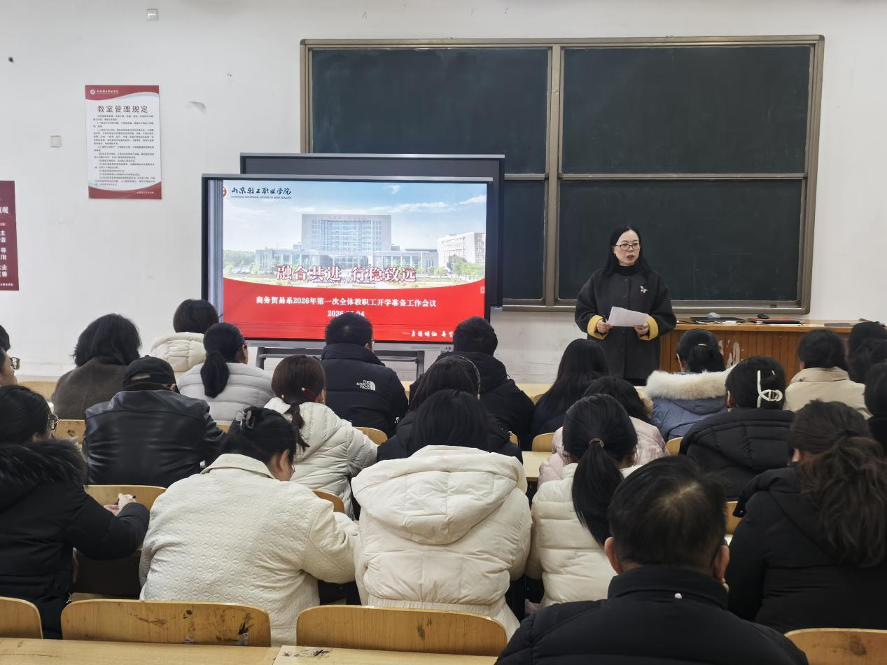 2026年3月4日下午,商务贸易系在T6406召开2026年第一次全体教职工开学准备工作会议。会议以“融合共进 行稳致远”为主线,锚定学校“加力提速年”发展目标,奏响新学期奋进号角。系党总支书记孙琳霞、系主任杨新月以及全体教师参加会议。
